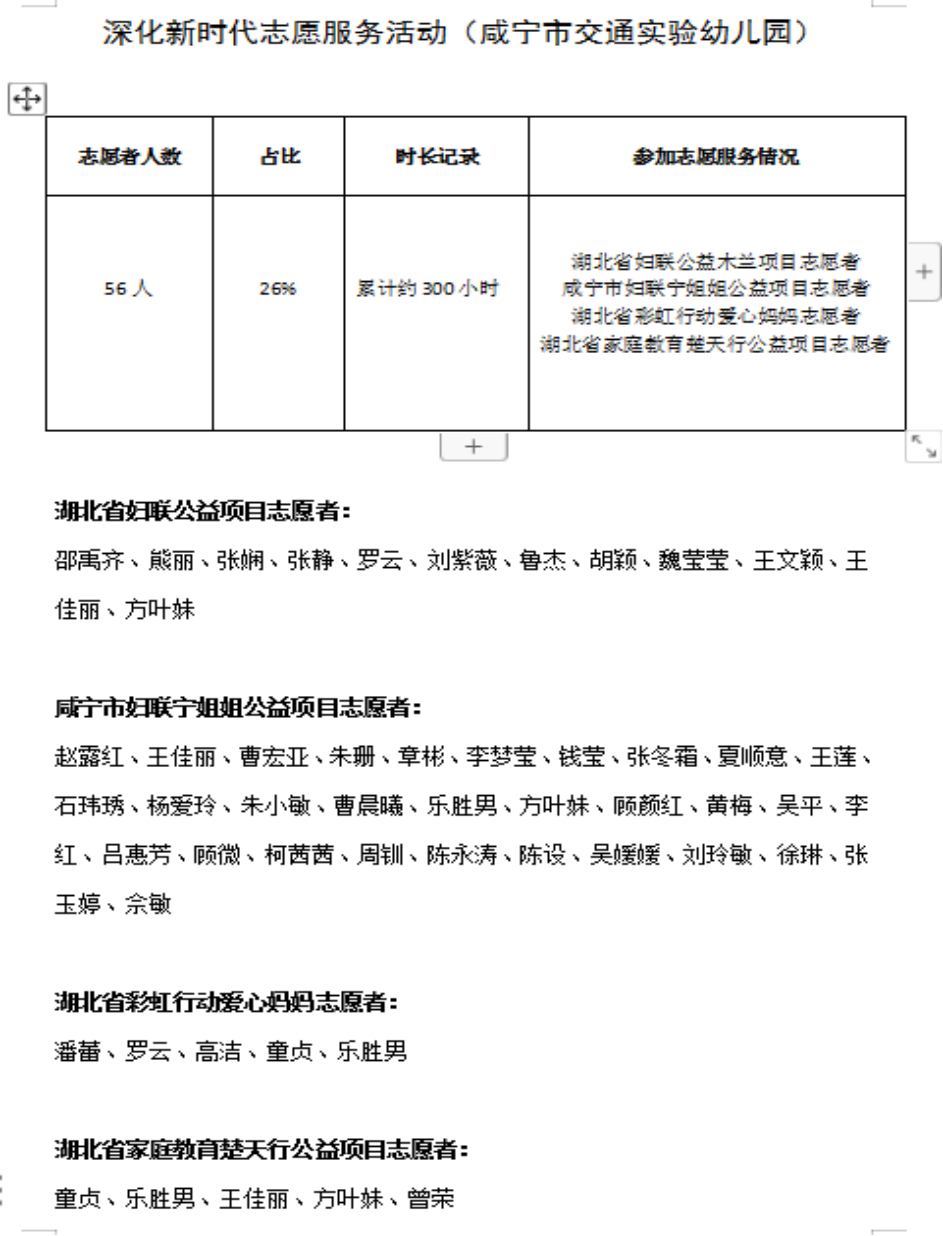 2.带队伍。在先进典型志愿者老师的带动下,该园共有10名家庭教育志愿者、4名家庭教育指导师和56名巾帼志愿者参与全市家庭教育工作,逐步形成了一支能力强、甘奉献的家庭教育志愿服务队伍。