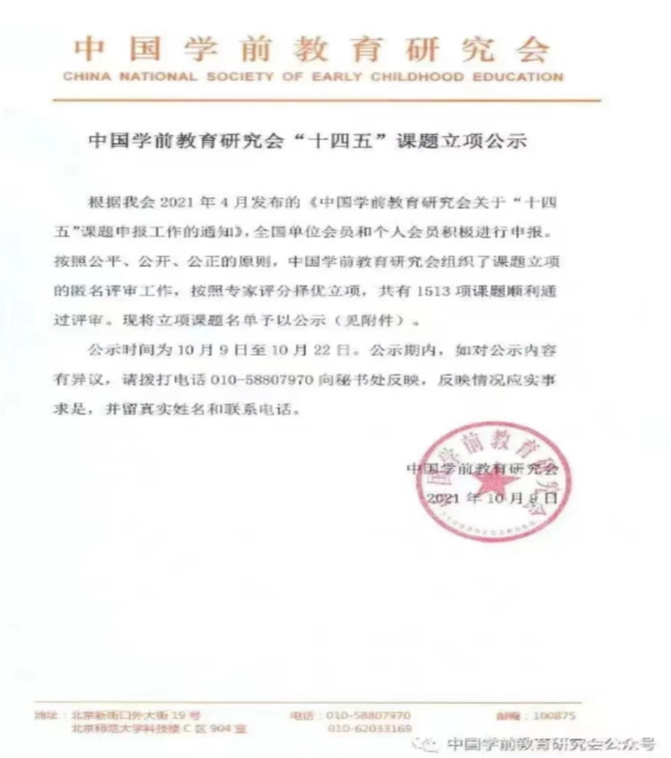 2021年,幼儿园国家级课题《0-3岁婴幼儿家庭教育的干预和影响》、市级课题《家园社协同育人视角下的幼儿德育教育实践研究》成功立项,至此拉开通过课题研究促进家庭教育发展的序幕。2018年至今,共成功申报湖北省科学规划课题、中国学前教育学会课题等各级各类课题24项,现已结题15项,多项课题研究成果荣获省市一等奖。在多年教学成果的积累下,出版大学生专业教材《幼儿园教育活动设计与实施案例教程》、学前教育教参《幼小衔接课程的设计与实施》。