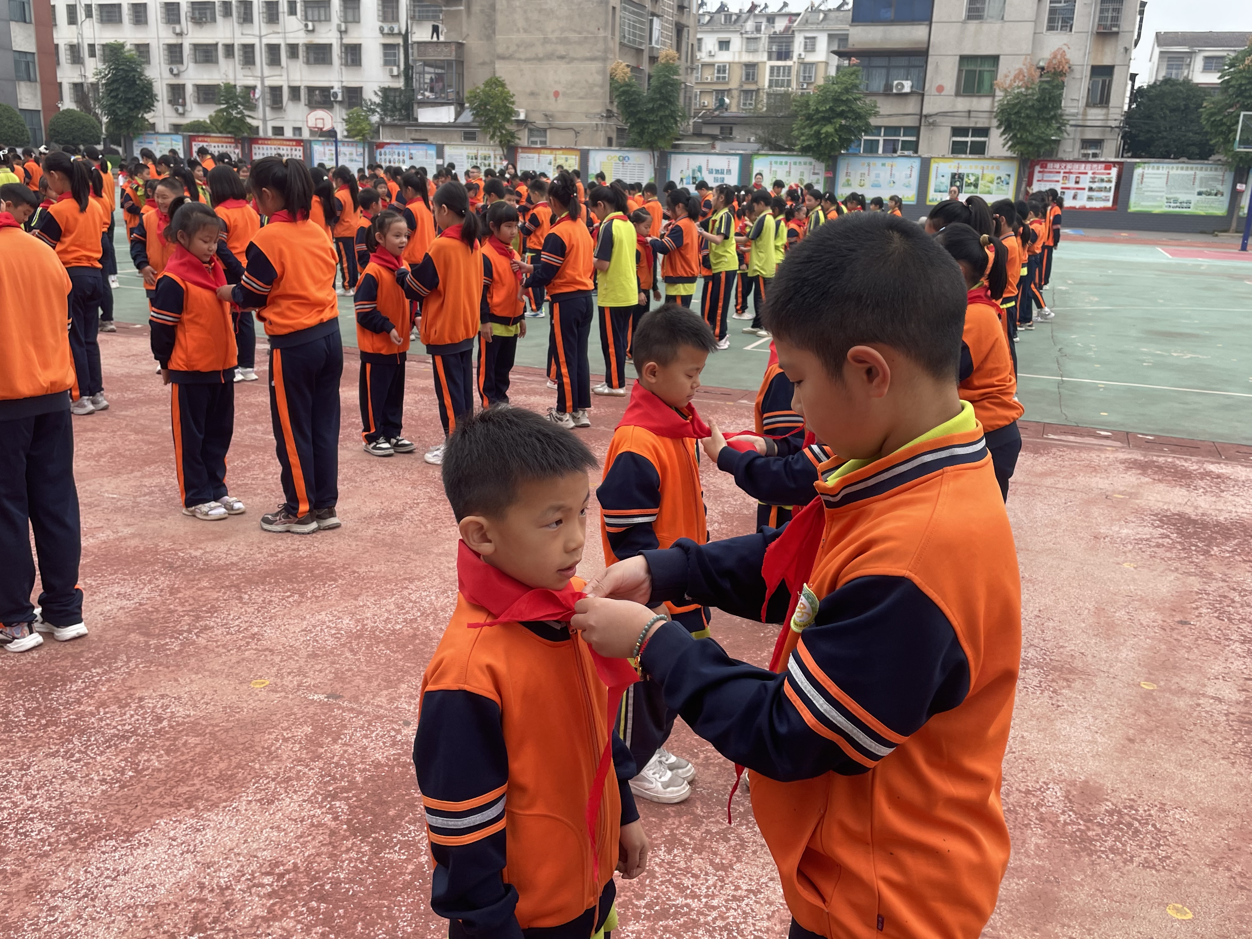 出队旗,唱队歌。在飘扬的队旗下,全体少先队员们齐声高唱《中国少年先锋队队歌》。嘹亮的歌声、坚定的眼神,诉说着队员们满心的骄傲与自豪;大队辅导员宣读了新队员名单;191名新入队同学佩戴上象征着荣誉和责任的红领巾,眼中流露出坚定的神情;入队宣誓环节,同学们高举右手,郑重宣誓,表示要时刻以一个好队员的标准要求自己,发扬优秀的传统,争当祖国的栋梁之材。
