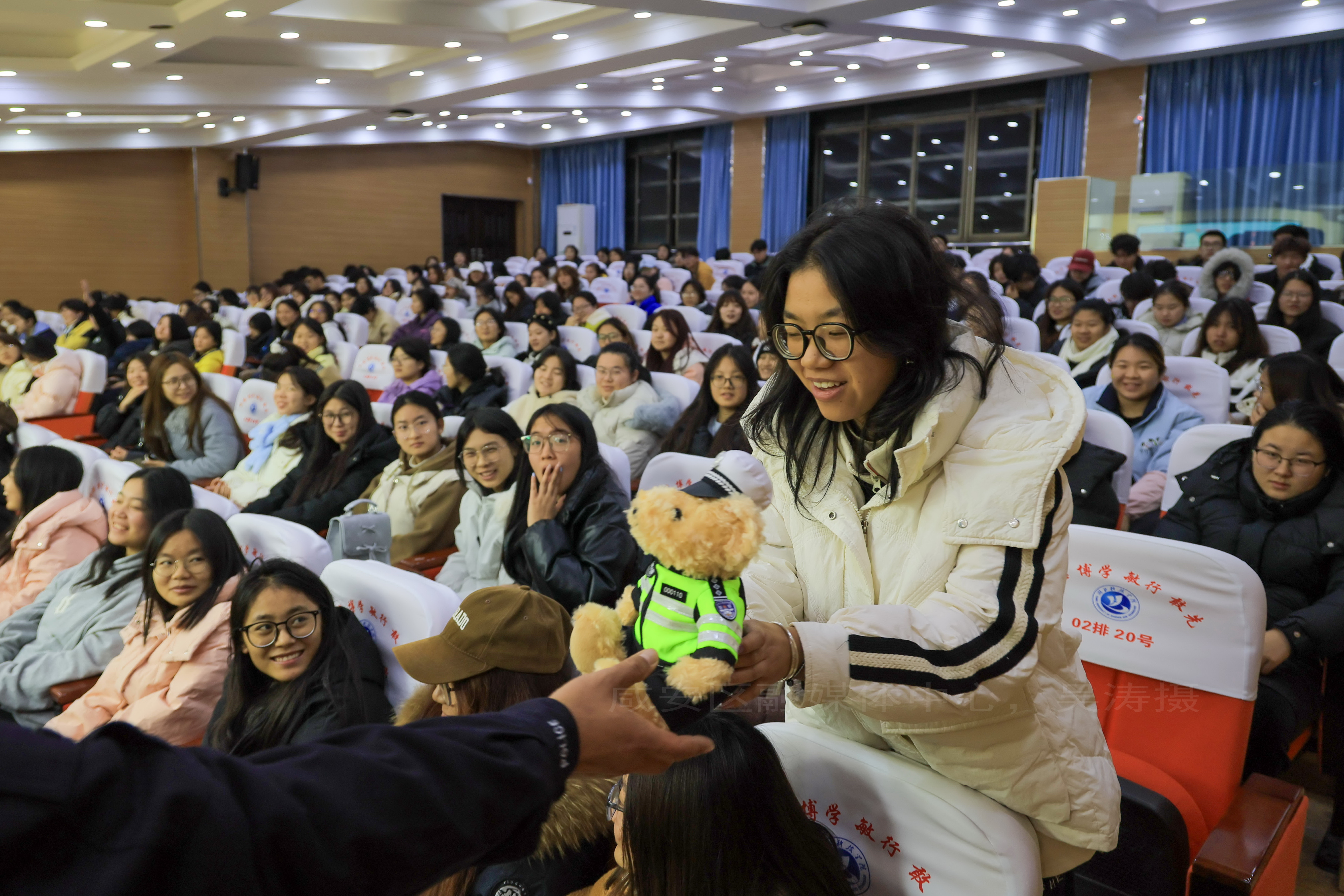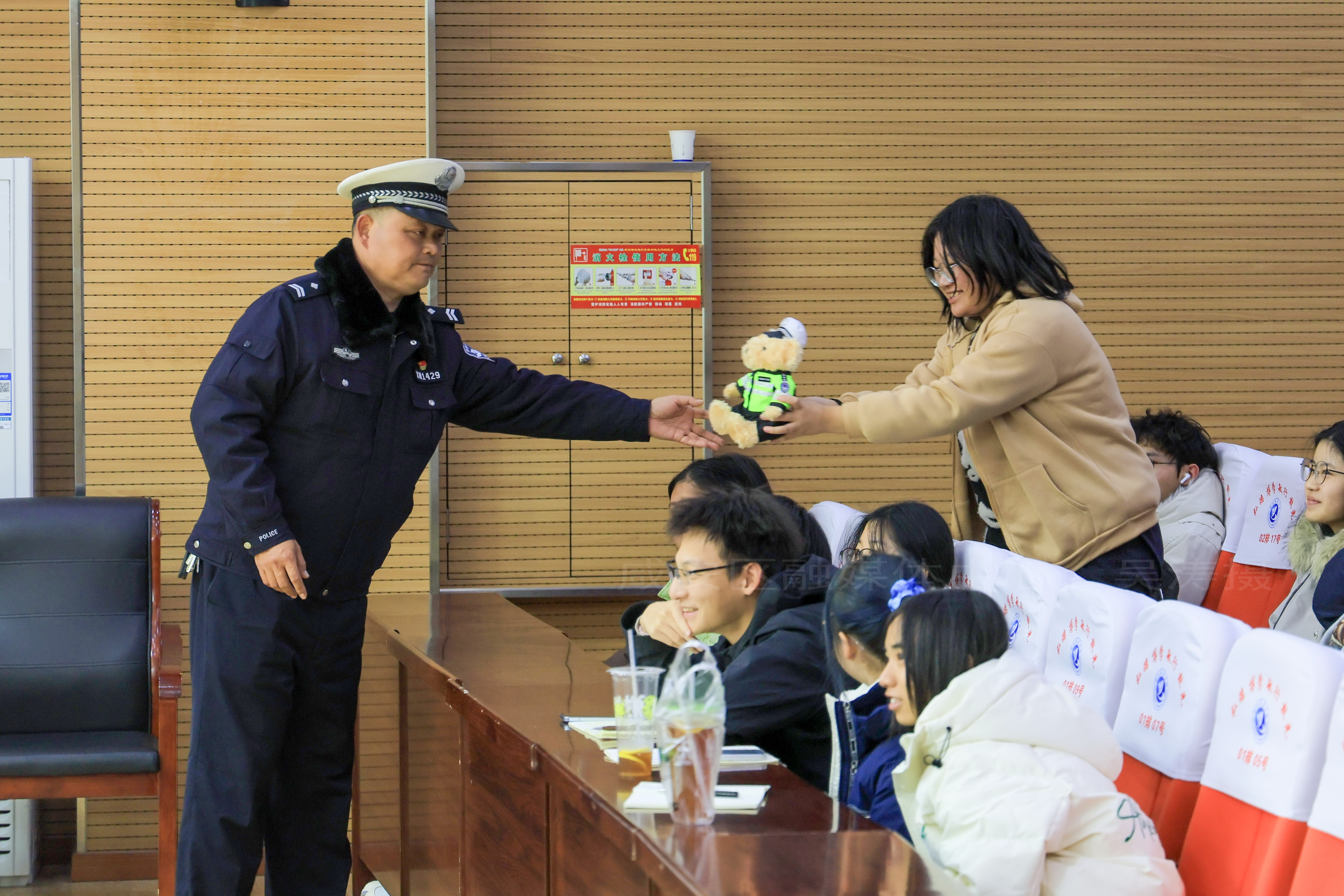 为增强互动性,讲座设置了交通安全知识有奖问答环节,同学们纷纷踊跃举手抢答,答对题目的大学生可获赠萌态十足的“交警小熊”玩偶,现场气氛热烈。这种寓教于乐的方式有效提升了学生们的参与热情,大家在积极抢答的过程中,进一步巩固了所学的交通安全知识。