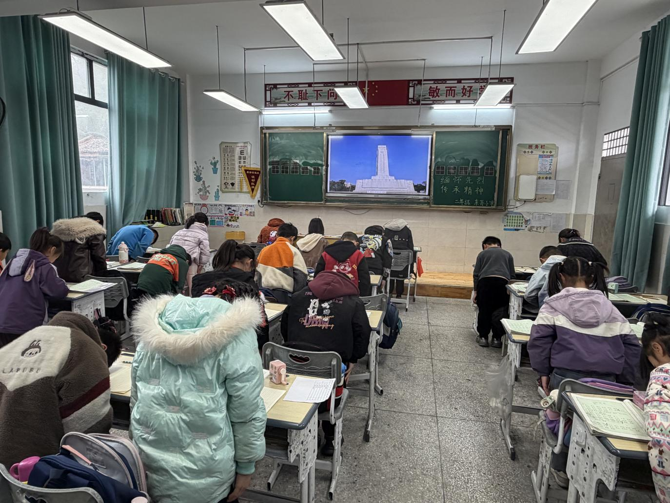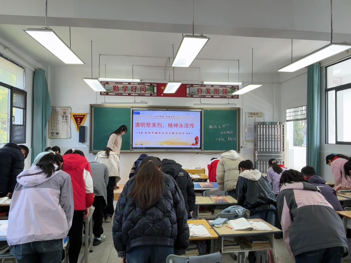 活动当天,全校各年级同步开展线下祭奠活动。教室里,学生们身着整齐校服,神情肃穆,全体起立,向革命先烈行鞠躬礼,表达最崇高的敬意与最深切的缅怀。随后,学生们齐声诵读英烈事迹、传唱红色歌谣,在铿锵有力的誓言中许下“传承先烈遗志,努力成长报国”的承诺。部分班级还组织学生分享自己搜集的英烈故事,从先烈的坚守与奉献中汲取精神力量,立志以先烈为榜样,将缅怀之情转化为学习的动力。