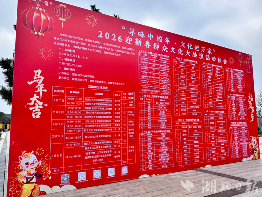 湖北日报客户端讯(通讯员祁声坤)2月7日,二乔公园内,人声鼎沸,红火热闹。2026年“我们的中国梦——文化进万家”荆楚“红色文艺轻骑兵”全省启动仪式暨惠民演出在嘉鱼隆重举行之际,台下,一场以“乐在湖北‘马’上有喜·悦见咸宁——回嘉赶大集”为主题的盛大年货节同步火热开场。这不仅是一场琳琅满目的商品购销会,更是一场融合了购年货、品年味、赏年俗、享年趣的综合性新春嘉年华。142家参展商户、310多位参与者的热情,在这里交织汇聚,绘就了一幅生动鲜活的“嘉鱼年景图”。