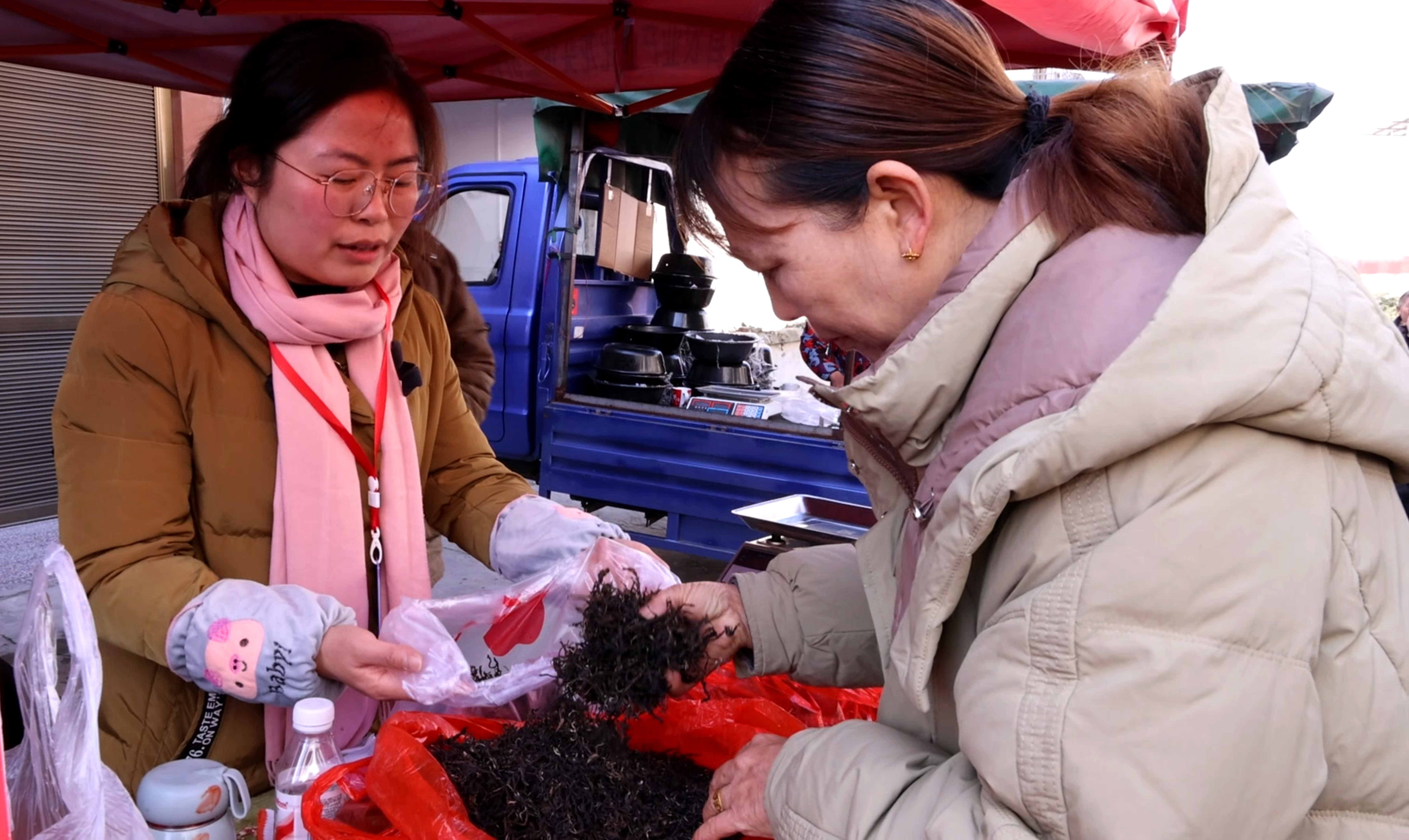 通城县马港镇松港村党建网格员 王秀:今天的生意异常火爆,大概是九点多在这边开始营业,现在基本上被抢购一空,农户带过来的干辣椒、干豆角,还有饼折已经没剩多少了,我们现在大概卖了两千多块钱,生意是我们没有想到的,首届能办这么好,也是我们没有想到的。