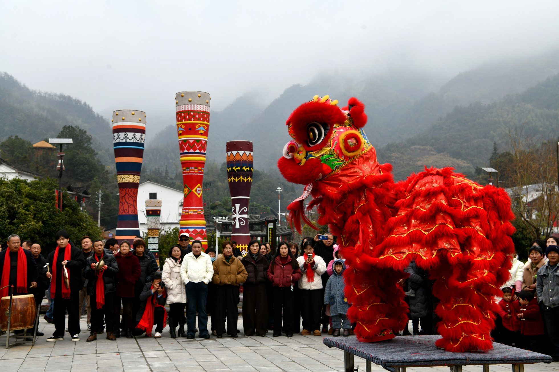 2026年1月27日,游客在湖北省咸宁市通城县药姑山古瑶村景区观看舞狮表演。