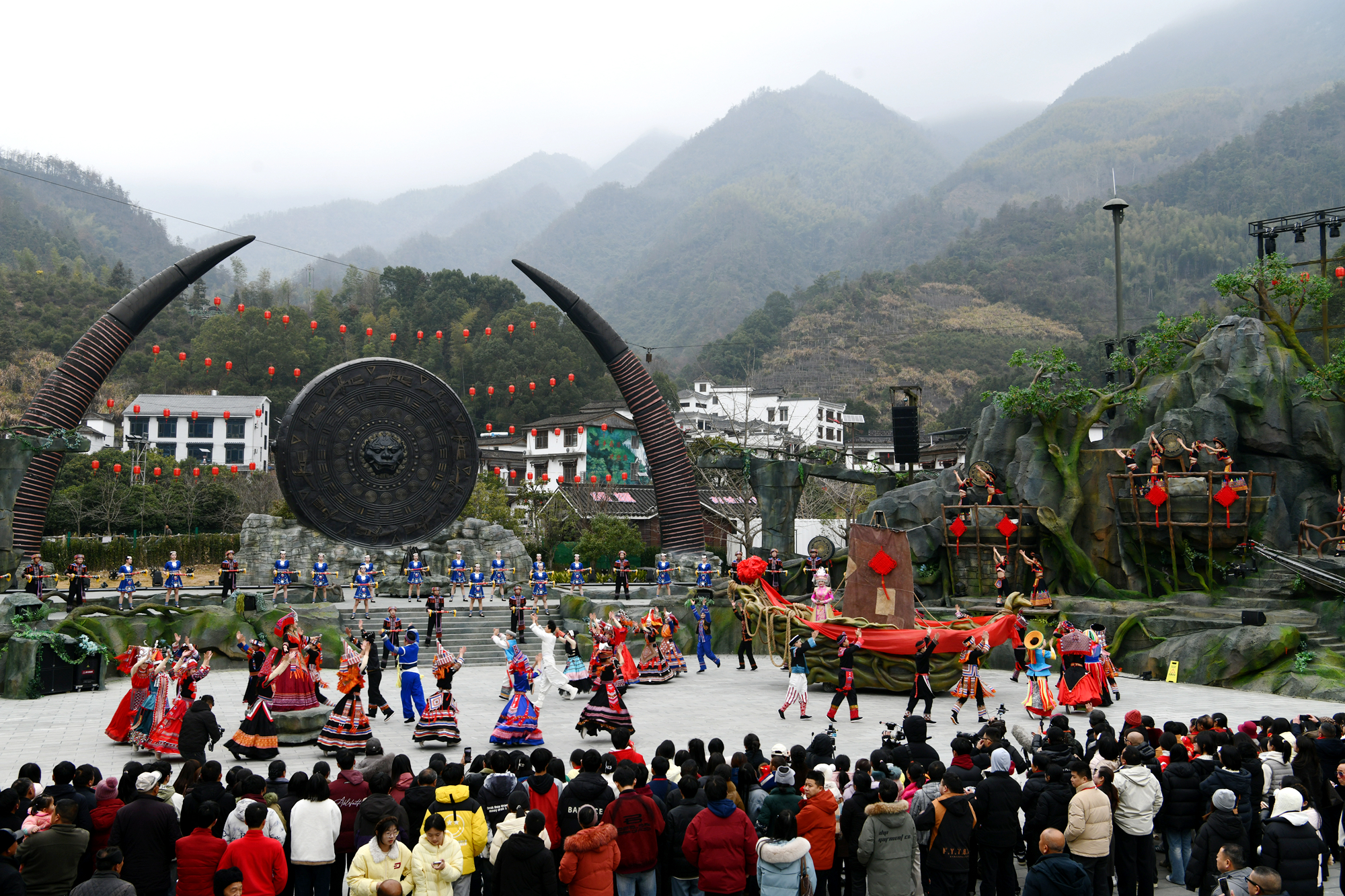 2026年1月27日,游客在湖北省咸宁市通城县药姑山古瑶村景区观看《龙船调》表演。
