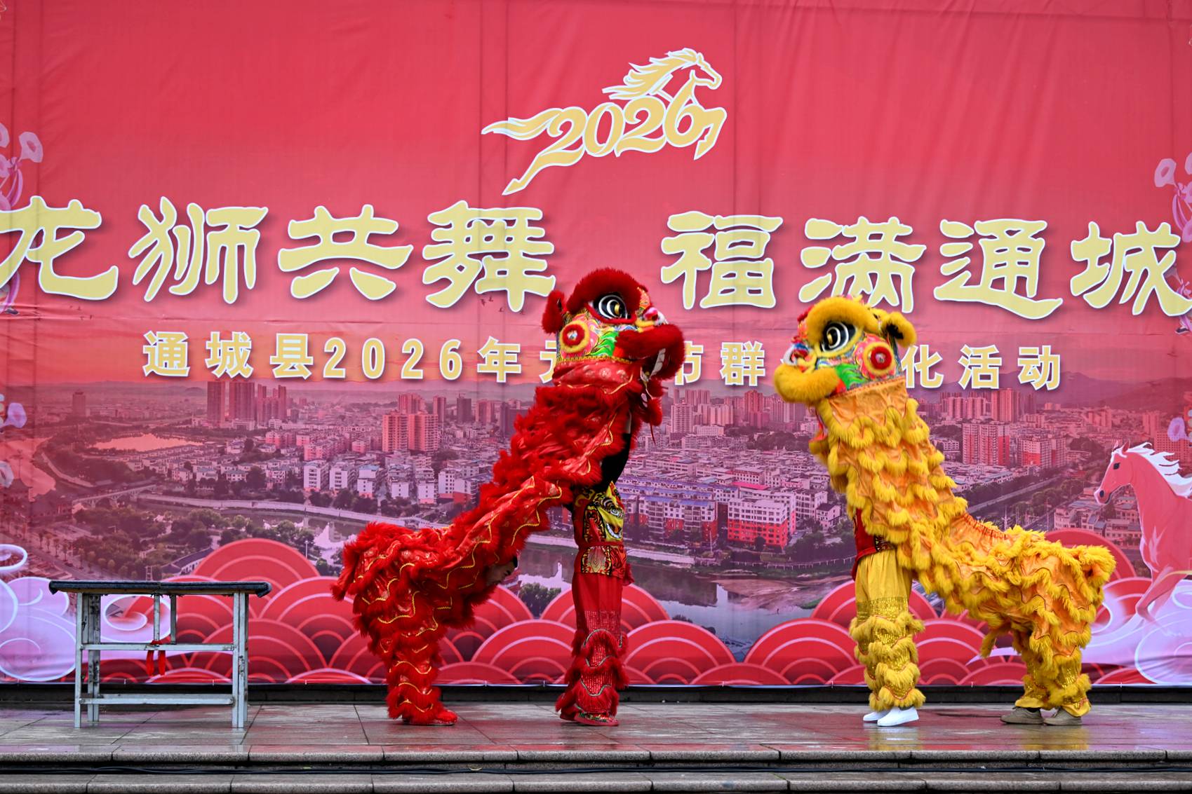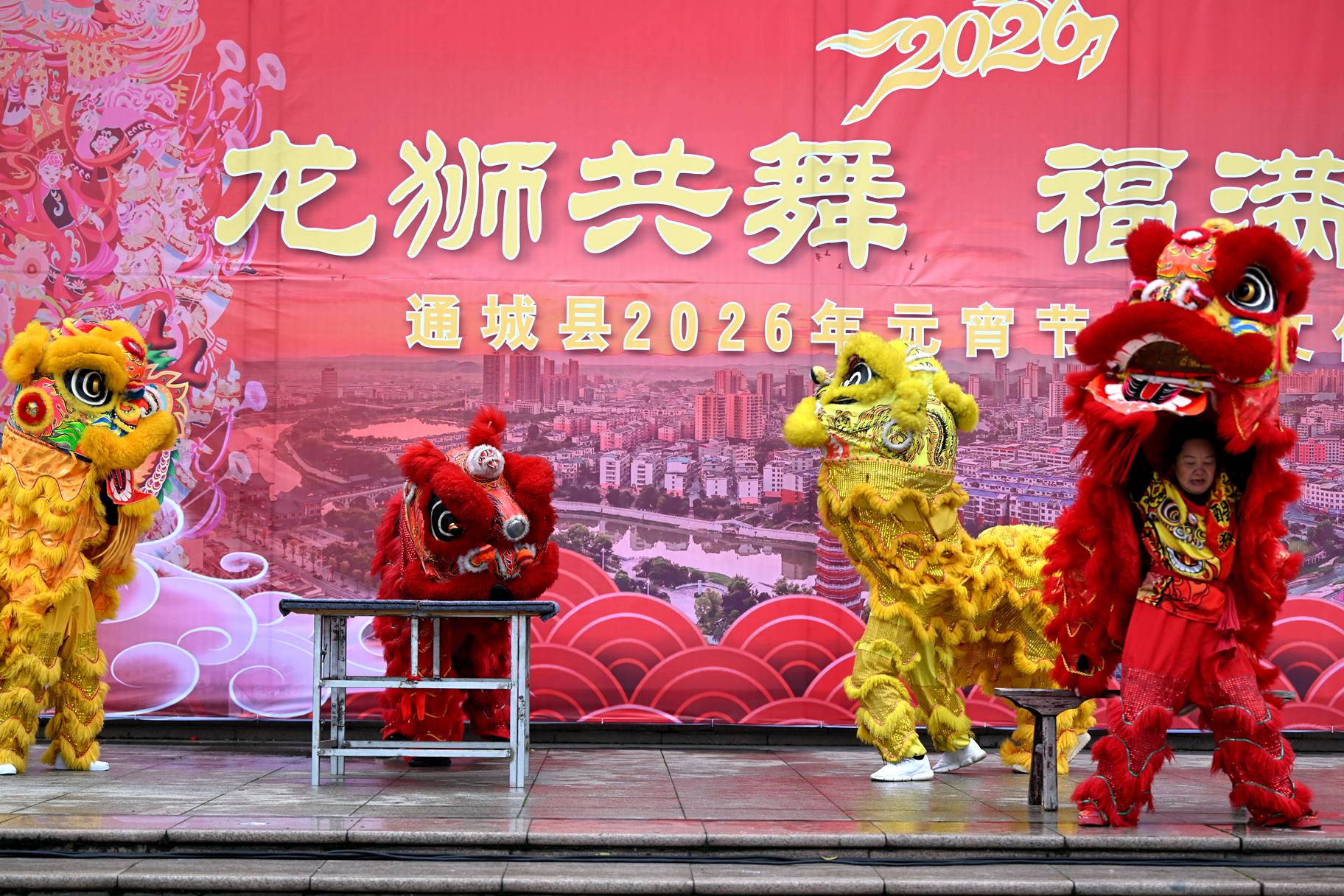 2026年3月3日,在湖北省咸宁市通城县举办的元宵节活动上,民间艺人开展舞狮表演。