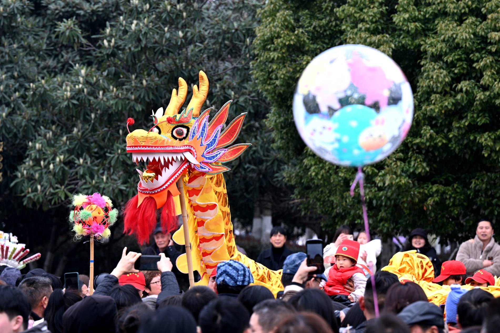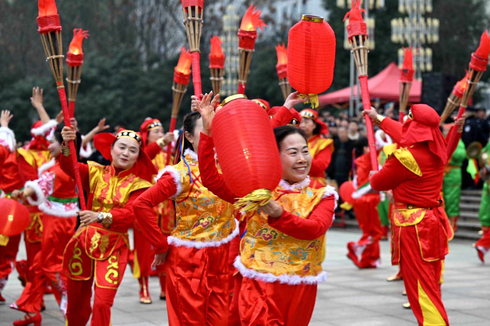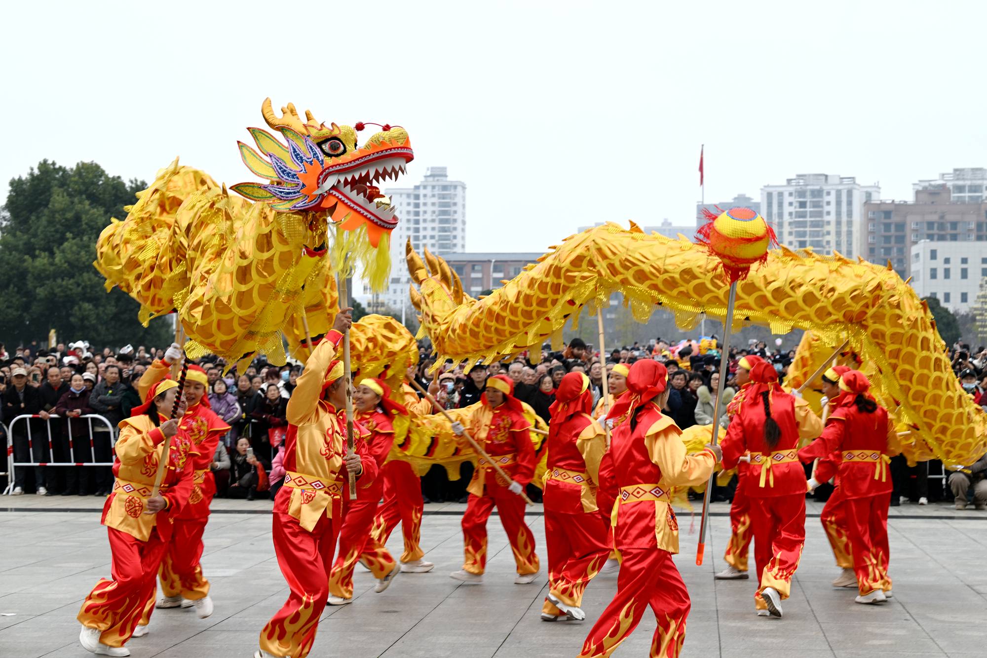 2026年3月3日,湖北省咸宁市通城县在银山广场举办元宵节“舞龙灯、猜灯谜、赛锣赛亮”民俗文化活动,民间艺人开展舞龙、舞狮、锣鼓等民俗表演,喜庆元宵节。
