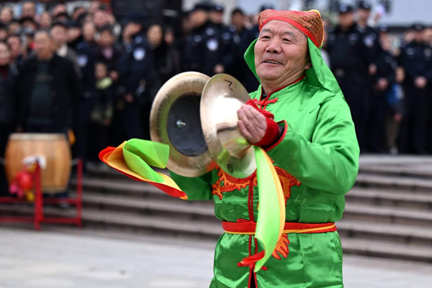 2026年3月3日,湖北省咸宁市通城县银山广场,民间艺人在省级非遗项目“赛锣赛亮”的活动中进行锣鼓表演。