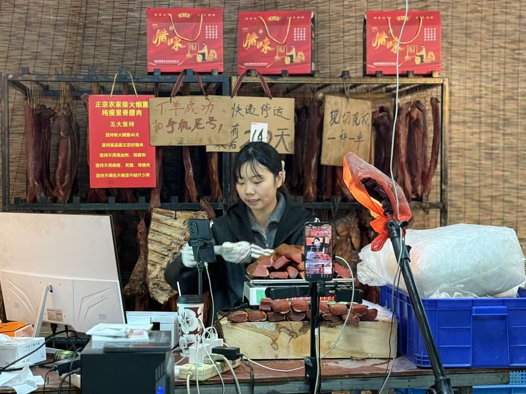 走出熏房,生产线上的工人正熟练地进行分切、包装;电商区内,“哒哒”的订单打印声宛如新春序曲,片刻不息;直播间里,主播正透过屏幕,将这份来自鄂南山乡的传统风味,送达天南地北的餐桌。