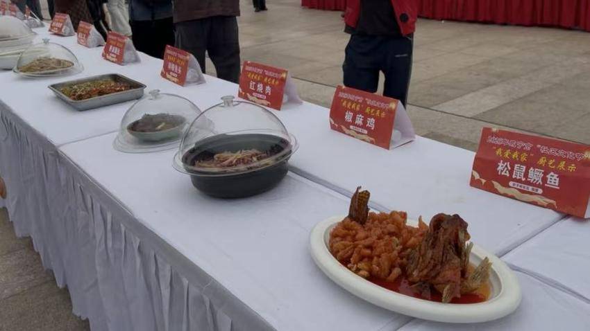 在“我爱我家”厨艺展示区,营里三宝、剁椒鱼头、椒麻鸡、松鼠鳜鱼、东坡肉等15道色香味俱全的菜品逐一展示。评委品尝菜肴后进行综合评分,最终沙子岭社区居民魏蒙自制的松鼠鳜鱼获得了第一名。