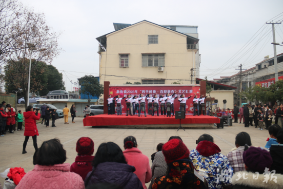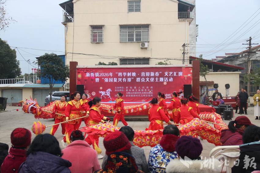 湖北日报客户端讯(通讯员梁宁)为丰富基层群众精神文化生活,营造新春喜庆氛围,2月4日上午,嘉鱼县新街镇2026年“四季村晚·喜迎新春”文艺汇演暨“强国复兴有我”群众文化主题活动在马鞍山村文化广场举办,为群众送上兼具艺术性与群众性的年味文化盛宴。