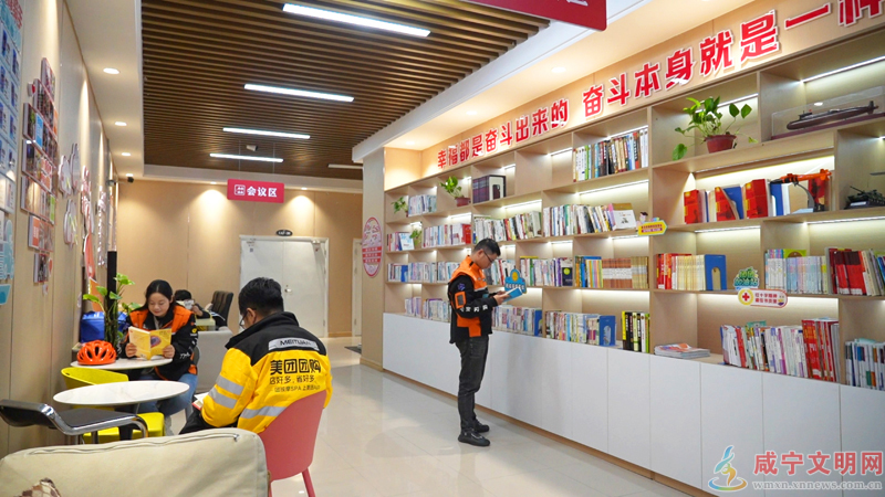 4月15日,在咸宁万达广场红色驿站,快递员们利用配送间隙,在驿站安静看书。驿站精心设置图书角,各类书籍齐全,不仅为奔波在外的户外劳动者提供休憩港湾,更搭建起暖心阅读空间。小小的驿站让新就业群体在奔波送件之余静心充电,在书香中放松身心、增长知识,尽显城市温情。