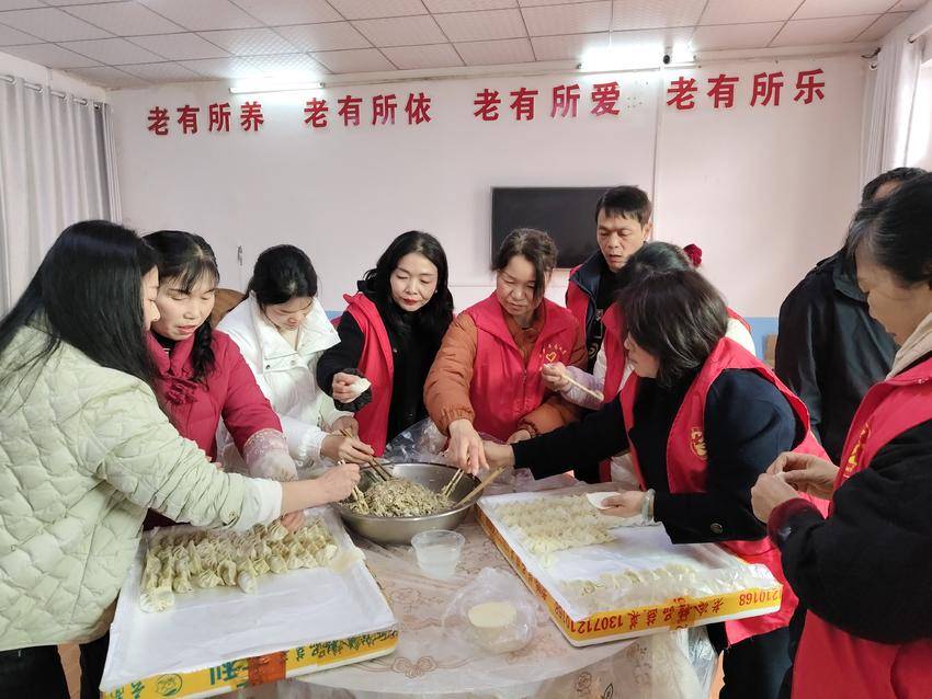 活动现场暖意浓浓,志愿者为老人送上米、面、油等生活物资,并与他们亲切交谈,询问他们的身体状况与生活需求。志愿者还分工协作,为老人们包饺子、烹制爱心餐食。