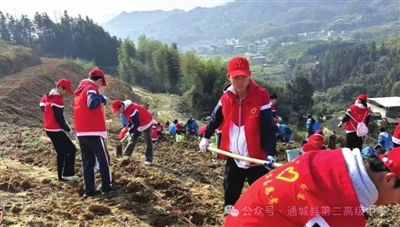 本网讯(记者 李思源 通讯员 吴子珺) 3月12日植树节,通城二中20名青年志愿者前往麦市镇七里村茶叶基地,参加由团县委组织的“隽邑添新绿 马年植青春”义务植树活动,用实际行动为家乡增添新绿。